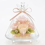 ケースにエンジェルがついているガラスドームフラワーです。結婚式や誕生日などに使えますね。